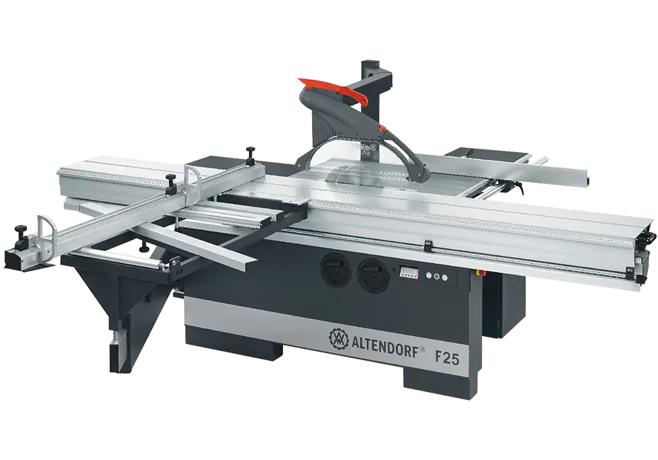 The Altendorf F 25 is a compact sliding table saw that offers all the necessary features while maintaining Altendorf's renowned quality. It provides exceptional precision, ease of use, and outstanding cutting performance, making it suitable for processing various materials, including particle board and MDF panels, solid wood, wood-like materials, and plastics. The saw unit can tilt to one side for miter cutting. The smooth-running sliding table is also based on the Altendorf system and comes standard with a digital display for height and tilt adjustments.