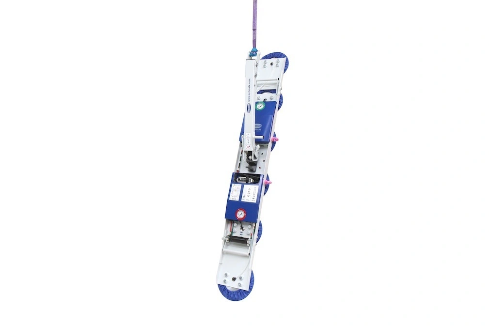 The vacuum lifting device VacuMaster Glass 450 from Schmalz is ideal for a safe handling of glass workpieces in outdoor areas. Attached to the site crane, it permits effortless lifting of loads up to 450 kg horizontally and vertically. Workpieces can also be swiveled manually by 90° and rotated by 360° with three locking points per right angle. Thereby the workpieces can be aligned perfectly and installed in the facade. Due to its modular design, the VacuMaster Glass can be easily adapted to the dimensions of the workpieces.