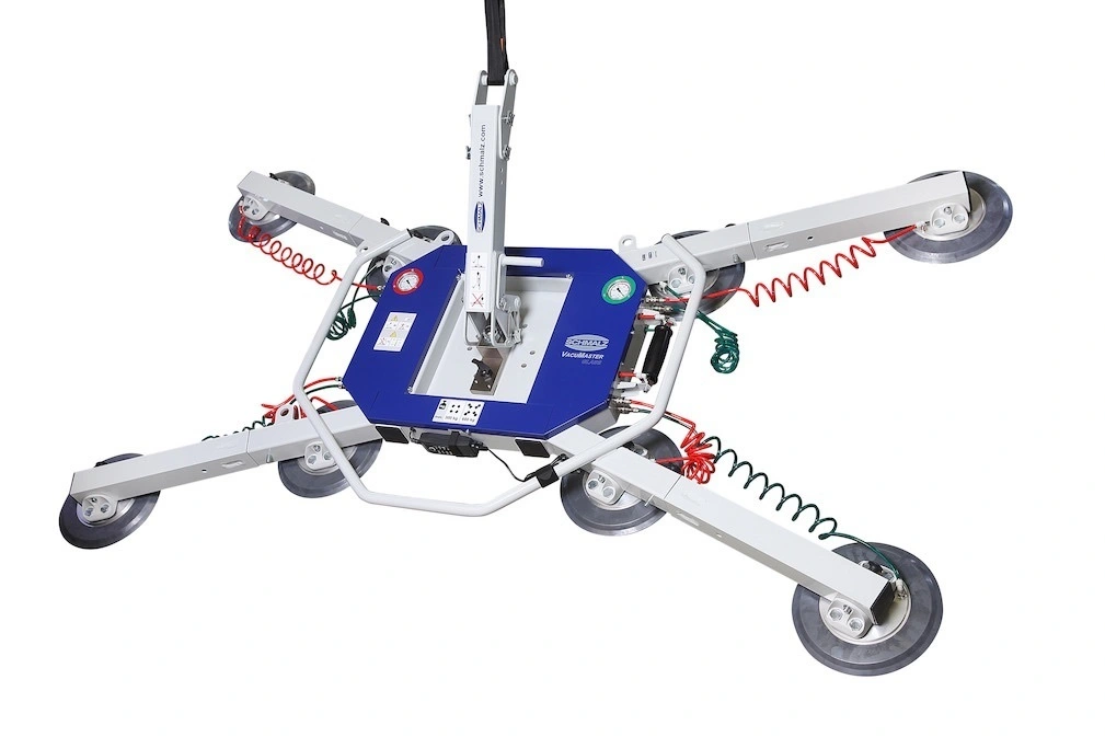 The vacuum lifting device VacuMaster Glass 600 from Schmalz is ideal for a safe handling of glass workpieces in outdoor areas. Attached to the site crane, it permits effortless lifting of loads up to 600 kg either in a horizontal or vertical position. Workpieces can also be swiveled manually by 90° and rotated by 360° (in 45° increments). Thereby the workpieces can be aligned perfectly and installed in the facade. Due to its modular design, the VacuMaster Glass can be easily adapted to the dimensions of the workpieces.