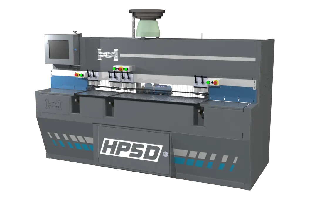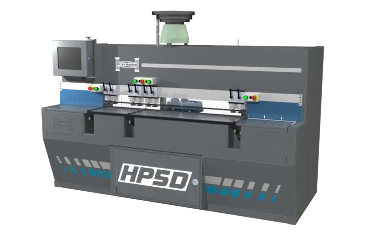 The model HP5D is a horizontal point to point bore and dowel insertion and panel groove machining center. It is designed to CNC position a drill spindle, bore a hole, then CNC position the dowel inserter, inject glue or water (for pre-glued dowels), and insert the dowel into the hole. As well as cut a panel groove in the center section of the inside edge of the door stile and the entire inside edge of the door rail material.