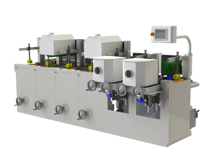 Inverters control the feed rate, spindle speed, and rotational direction. Larger diameter sanding and wire brushes deliver best results. Top and bottom spindles are belt driven for increased torque. Side heads may have tilt and vertical adjustment with direct drive motors, or be belt driven to increase torque.