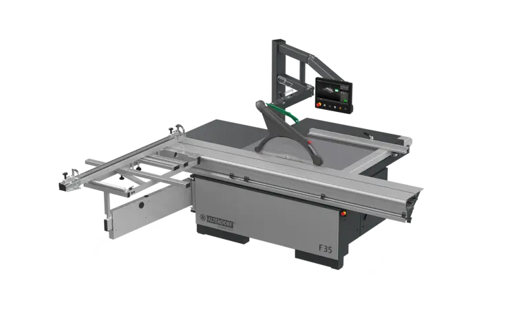 The Altendorf F 35 Type 3 is designed as a central production machine for modern workshops. Its solid steel construction ensures long-term stability, smooth running characteristics, and reliable performance. A proven double-roller carriage, combined with motorized blade height and tilt, delivers high precision and operator comfort for daily production. The new 15” eye-level touch control — swiveling and tiltable — simplifies setup and supports safe, efficient operation.